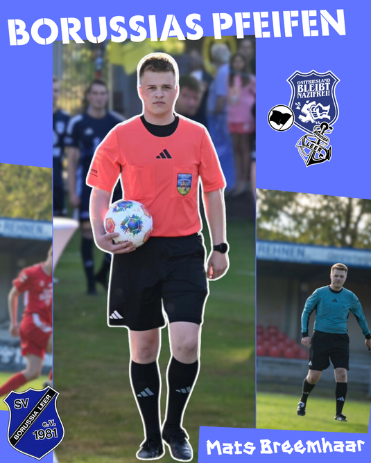 âčïž Mats Breemhaar (19) begann vor etwa zwei Jahren mit dem Pfeifen. Zuvor war Mats fĂŒr Borussia am Ball aktiv und ist zwischendurch immer noch bereit, das Borussia-Trikot ĂŒberzustreifen. In dieser kurzen Zeit hat Mats schnell einige Stufen erklommen und ist etwa in der Bezirksliga vom Assistenten zur Spielleitung aufgestiegen.