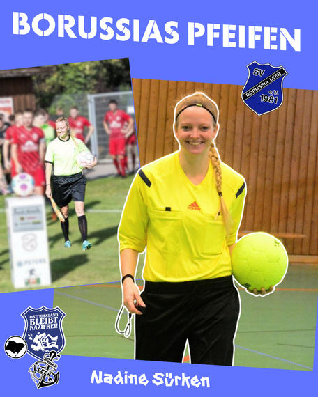 ℹ️ Nadine Sürken (36) hat sich vor etwa zwei Jahren dazu entschieden, zur Pfeife zu greifen. Mit dem Ball spielt Nadine schon seit 20 Jahren aktiv für Borussia und plant auch zukünftig, beide Perspektiven auf dem Platz einzunehmen.